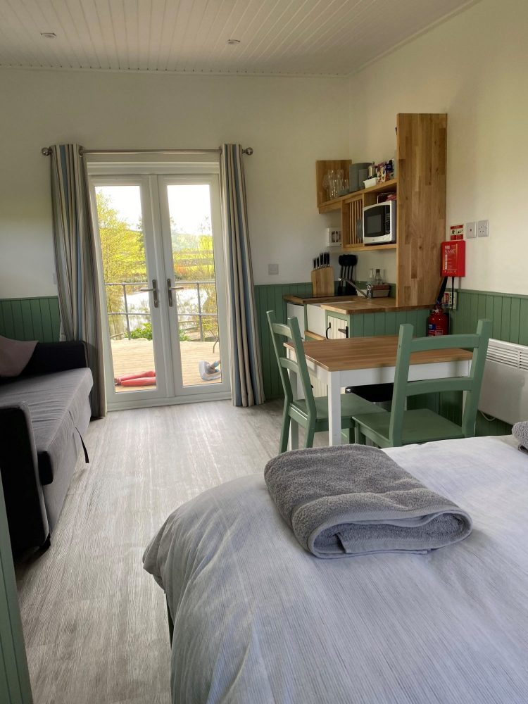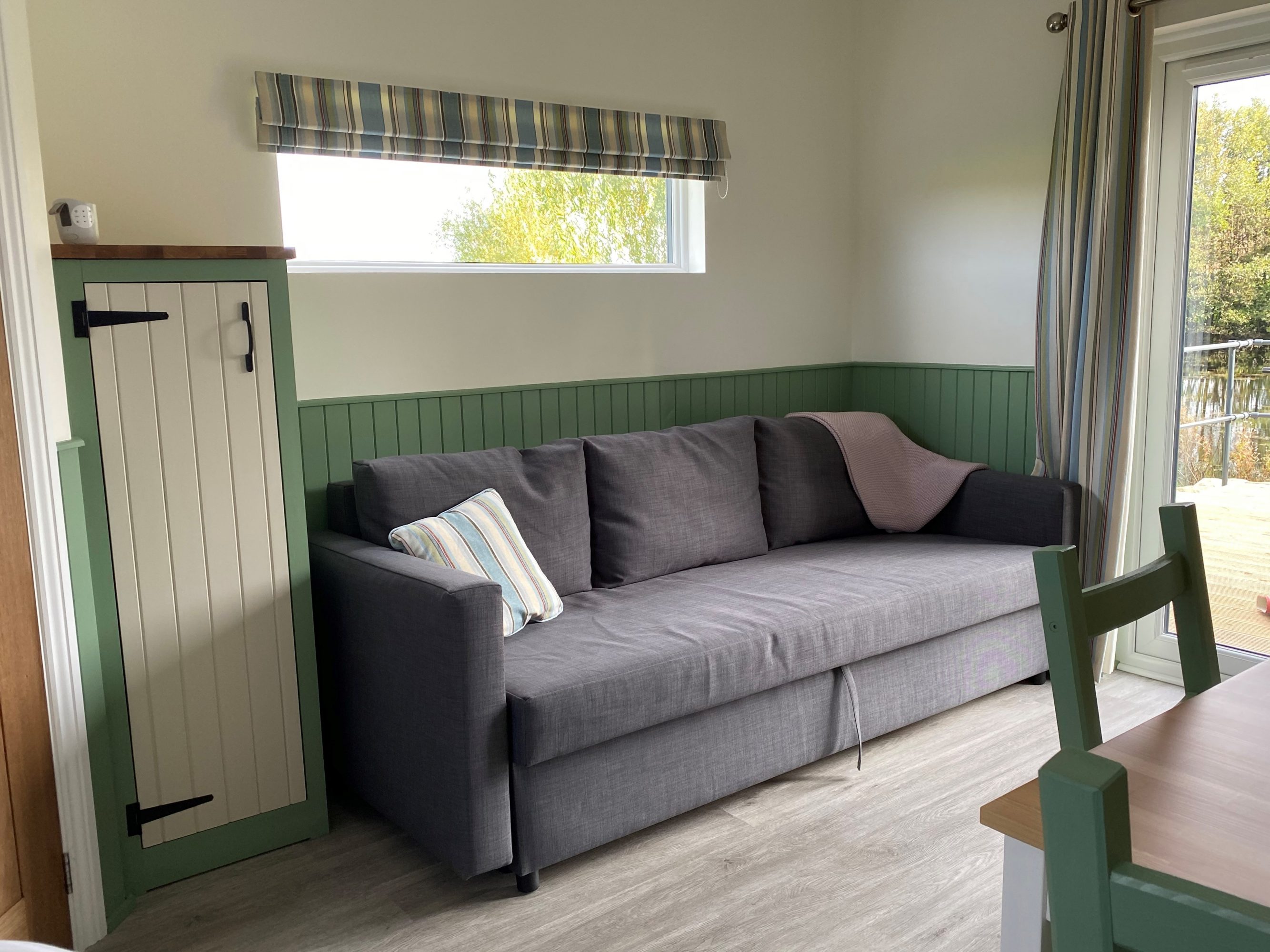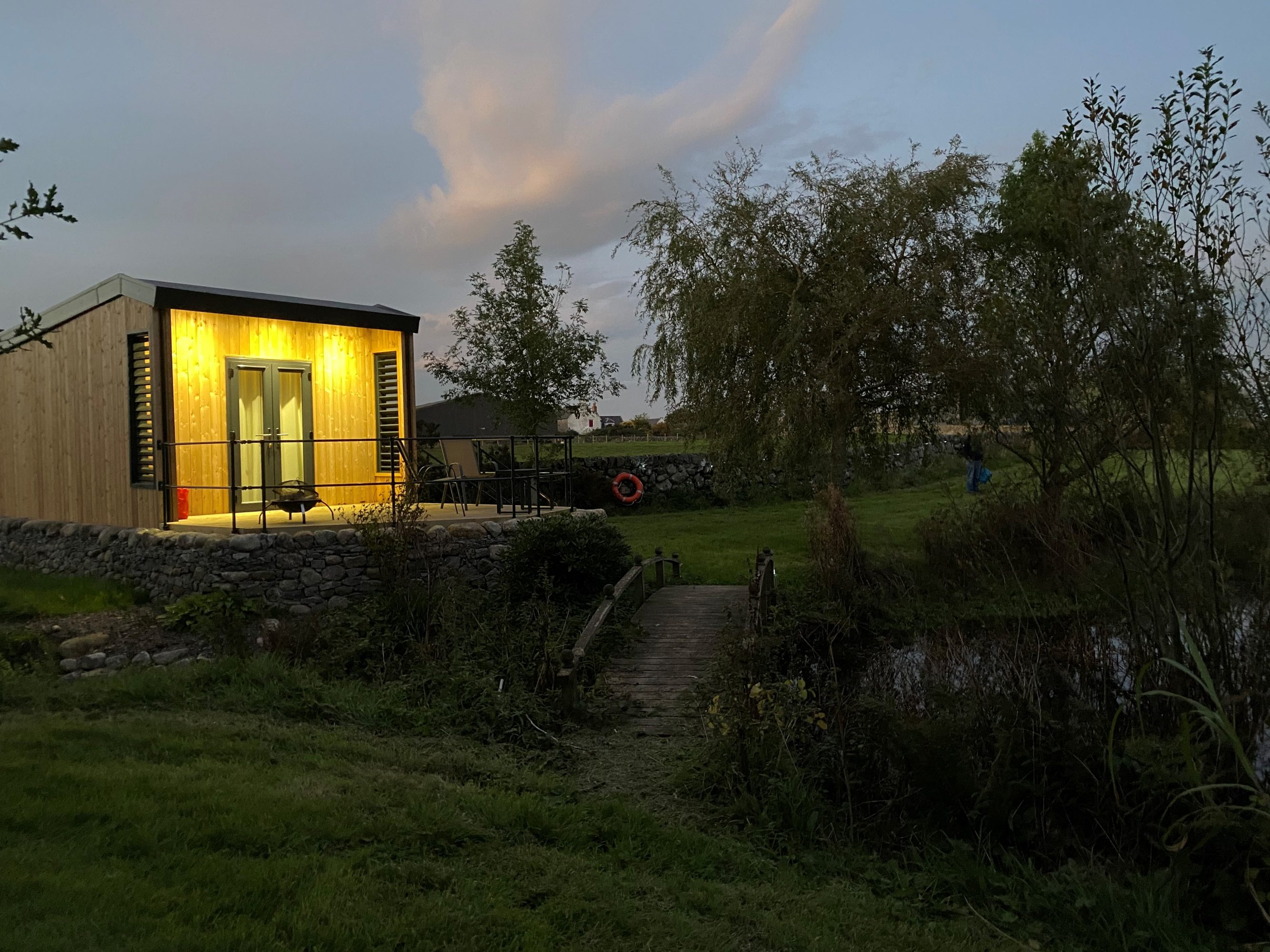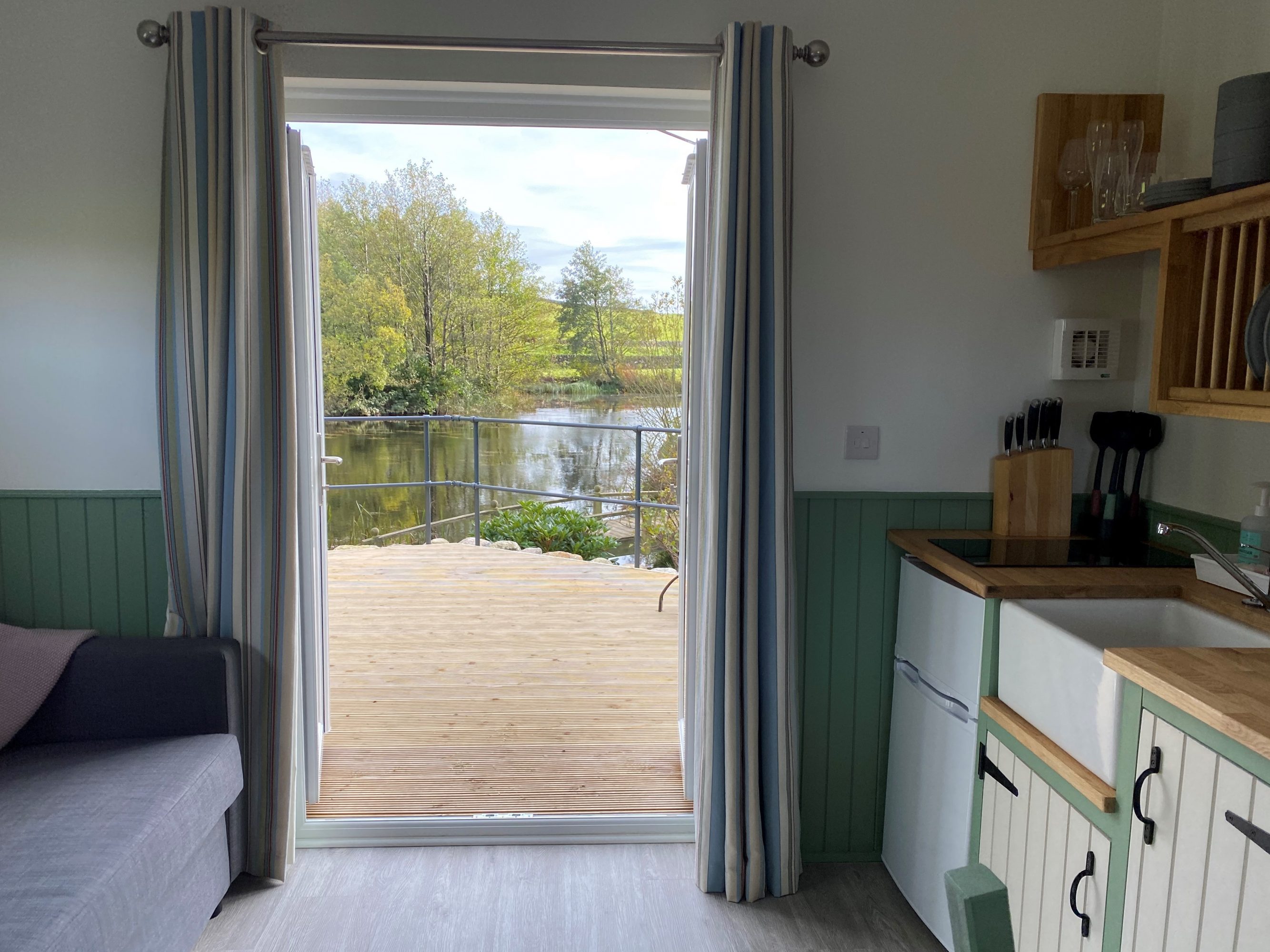 The Lily Pod is a self-contained holiday pod situated at our pond here at Lochhill Farm, New Abbey. The Pod sleeps up to 4 people but is more suited to two. It has an open plan bedroom, living, dining and mini kitchen area and an enclosed shower room.
